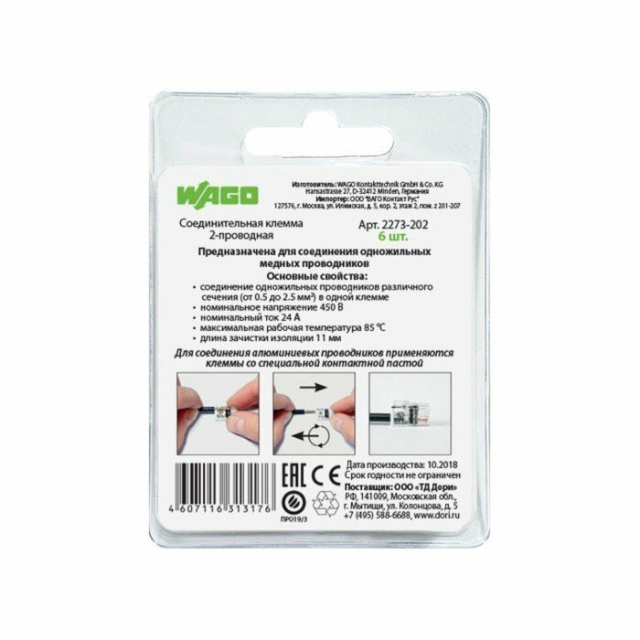 WAGO Соединительная клемма WAGO 2-х проводная (2273-202) 6 шт. в блистере