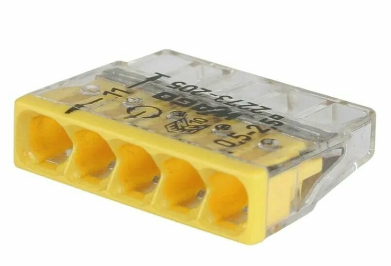 Соединительные клеммы WAGO COMPACT 2273-205 для одножильных проводников, макс. 2,5 мм, 5-проводн,прозрачный корпус, желтая крышка, прозрачные 100 шт/упак