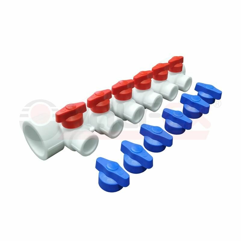 Коллектор универсальный 32х20 - 5 выходов полипропиленовый с красными и синими ручками для отсечных кранов Valfex