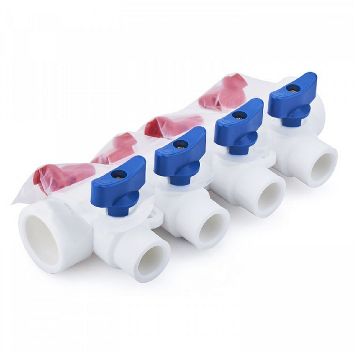 Коллектор универсальный 32х20 - 4 выхода полипропиленовый с красными и синими ручками для отсечных кранов Valfex