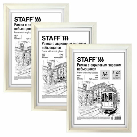 Купить Рамка 21х30 см небьющаяся, Комплект 3 шт., багет 17 мм Мдф, Staff Carven, белая, 391325