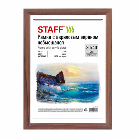 СохранитьРамка для фото, фоторамка 30х40 для фотографий, картин, грамот, вышивки на стену с небьющимся стеклом, багет 17 мм МДФ под дерево мокко, Staff, 391321 интересное: