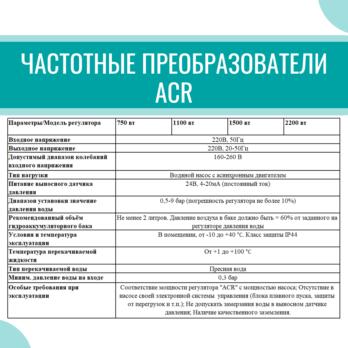 Частотный преобразователь для насоса ACR 1500 Вт, 220В, однофазный интересное: