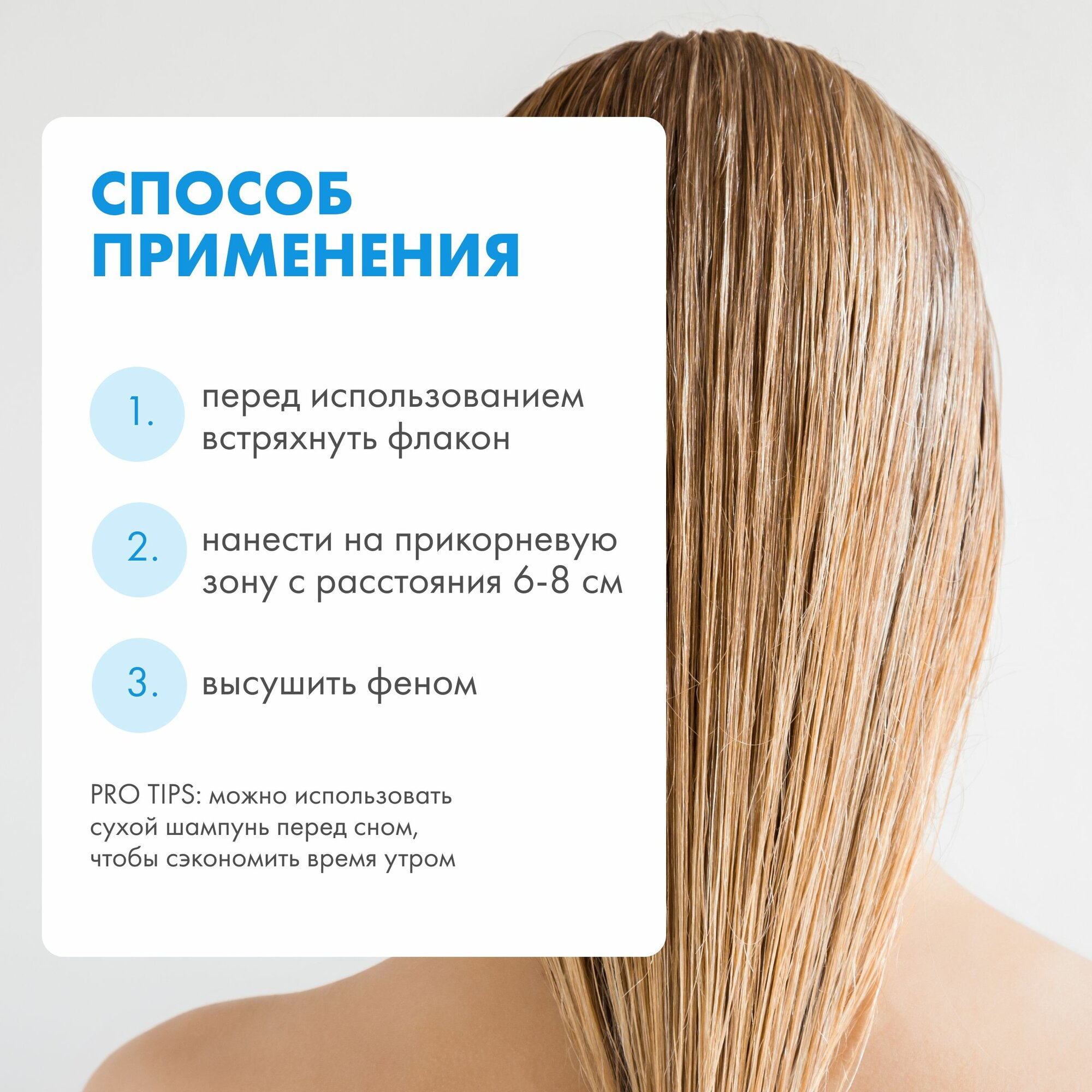 | Способ применения | перед использованием встряхнуть флакон, нанести сухой шампунь на прикорневую зону с расстояния 6-8 см. высушить феном. |