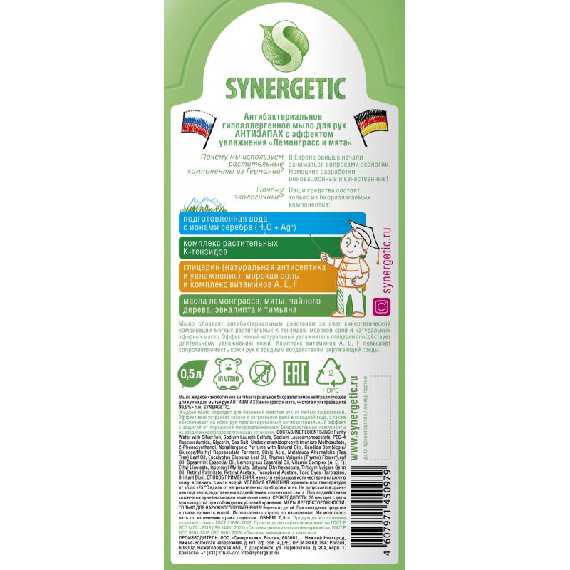 Жидкое мыло для рук Synergetic антибактериальное нейтрализующее запах "Лемонграсс и мята" 500 мл
