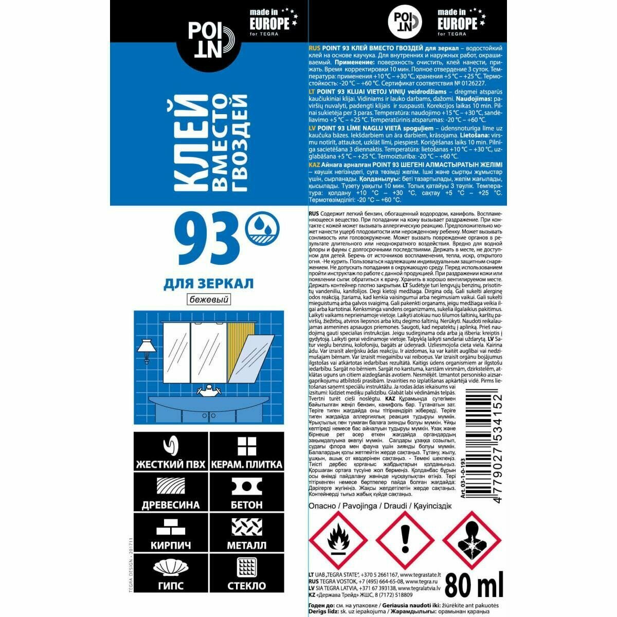 Монтажный клей POINT 93 Для зеркал (80 мл) 0.08 л тюбик