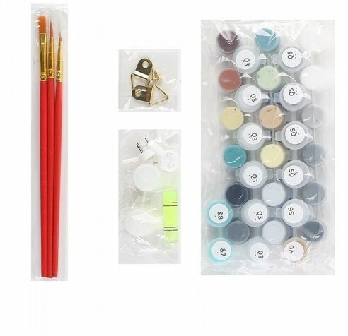 | Комплектация | подготовленный холст с деревянными рейками и шнуром, нейлоновые деревянные кисти разного размера, 3 шт., профессиональные акриловые краски, устойчивые к выцветанию, контрольный лист можно скачать на сайте производителя, указанном на упаковке. |