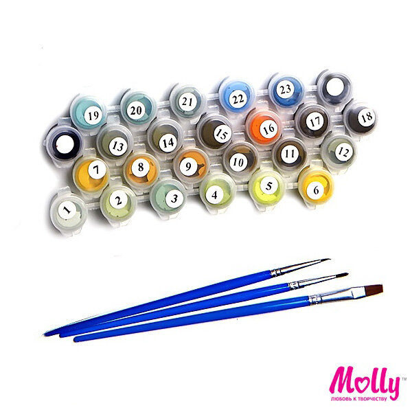 | Комплектация | прогрунтованный холст из натурального хлопка на деревянном подрамнике, нейлоновые кисти трех размеров 3 шт., акриловые краски, устойчивые к выцветанию, петли и саморезы для крепления на стену, контрольная схема |