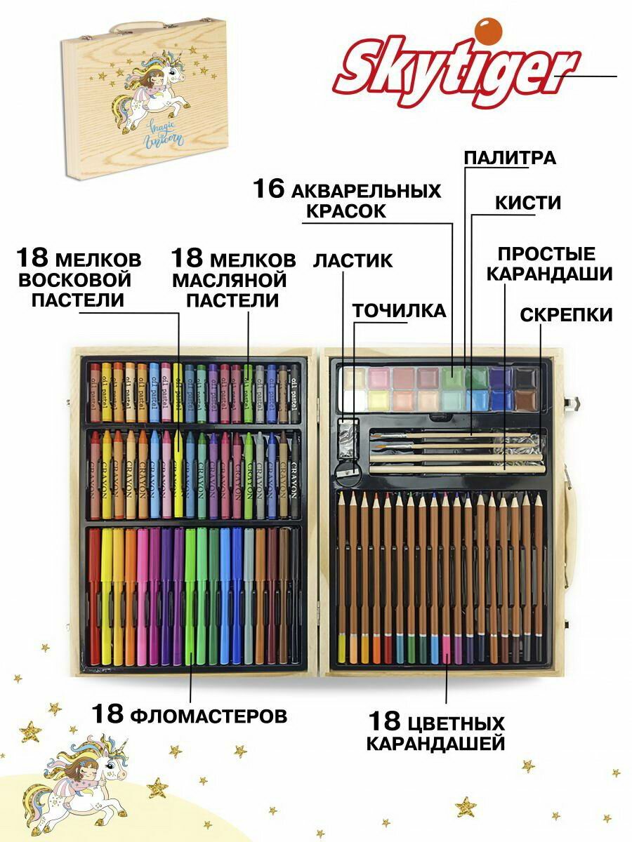 Купить Набор для рисования SKYTIGER Волшебный единорог в деревянном чемодане 100 предметов