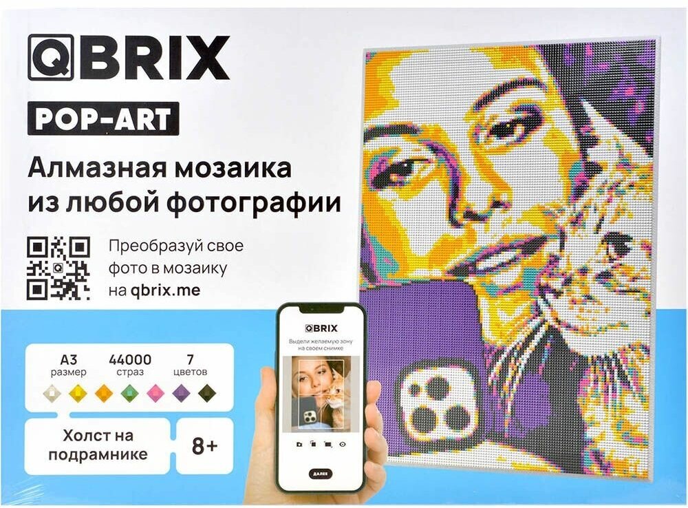 | Дополнительная информация | С чего начать? 1. Покупаете набор алмазной мозаики на подрамнике А3 от QBRIX; 2. Заходите на официальный сайт производителя в раздел «Алмазная фото-мозаика»; 3. Вводите индивидуальный код и загружаете желаемую фотографию; 4. Выбираете понравившийся вариант сборки; 5. Получаете инструкцию и приступаете к созданию картины. |