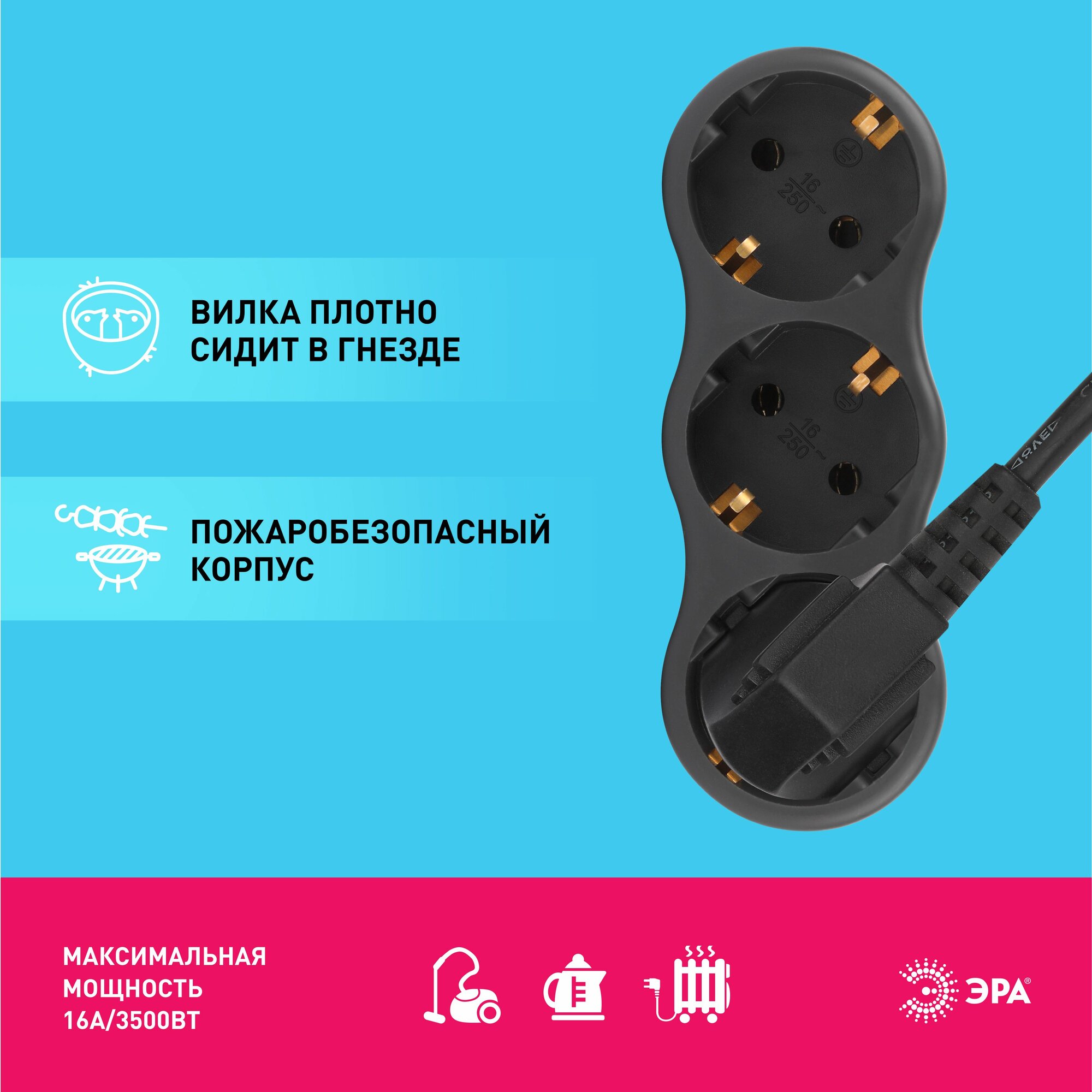 Купить Разветвитель электрический ЭРА SPx-3e-B на 3 розетки с заземлением 16А черный