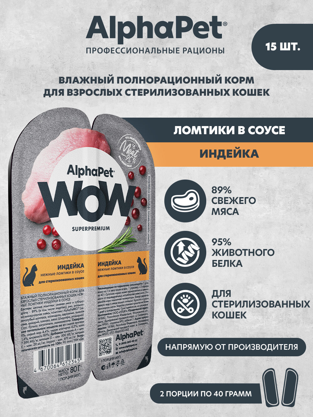 Влажный полнорационный корм для взрослых стерилизованных кошек нежные ломтики индейки в соусе AlphaPet WOW Superpremium 80г (Упаковка 15 блистеров) интересное: