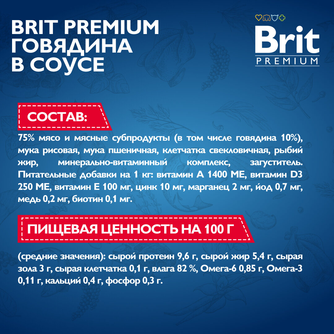 Влажный корм для собак. Пауч для взрослых собак всех пород, Говядина в соусе, 85г, 14 шт BRIT PREMIUM интересное: