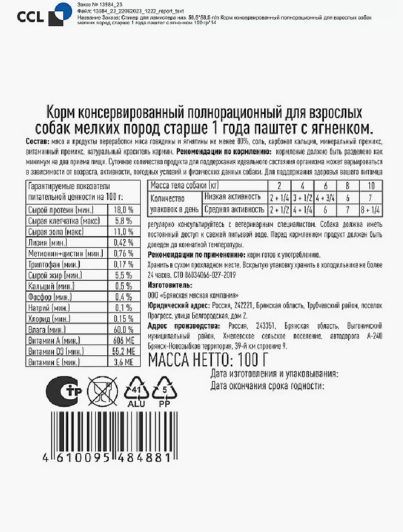 | Дополнительная информация | Корм готов к употреблению. |