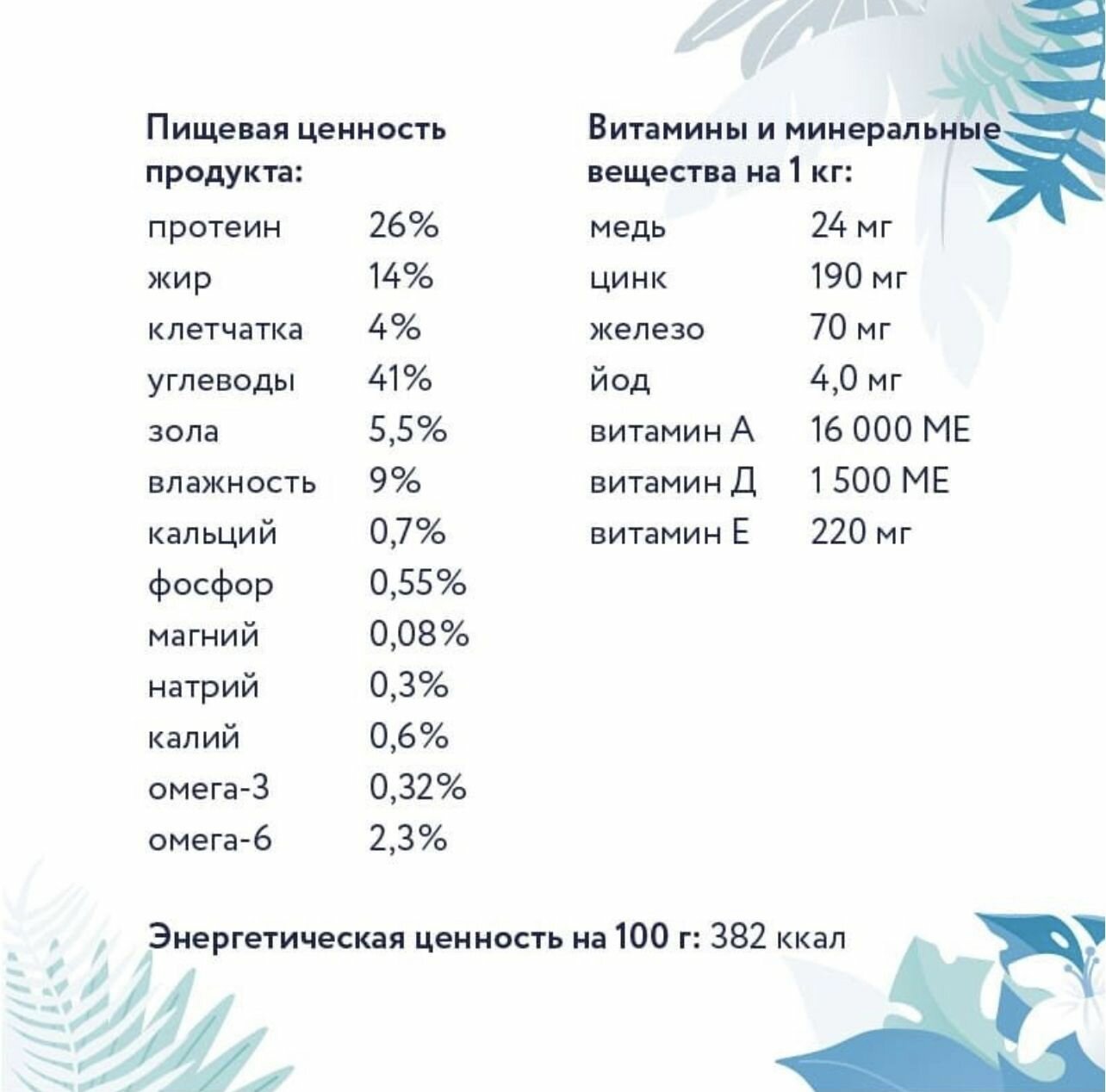 | Пищевая ценность | протеин 27%, жир 14%, клетчатка 2,4%, зола 5%, влажность 9%, кальций 0,65%, фосфор 0,5%, магний 0,06%, натрий 0,3%, калий 0,6%, медь 24 мг/кг, цинк 190 мг/кг, железо 60 мг/кг, йод 4 мг/кг, углеводы 42%, витамин А 16000 МЕ/кг, витамин Д 1500 МЕ/кг, витамин Е 220 мг/кг, омега-3 0,32%, омега-6 2,5%. |