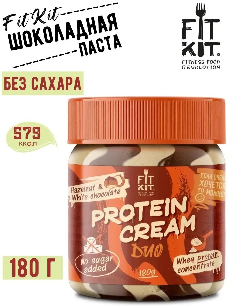 FIT KIT Шоколадно-фундучная паста Protein Cream DUO 180 г без сахара с белым шоколадом ,спортивное питание , полезные сладости