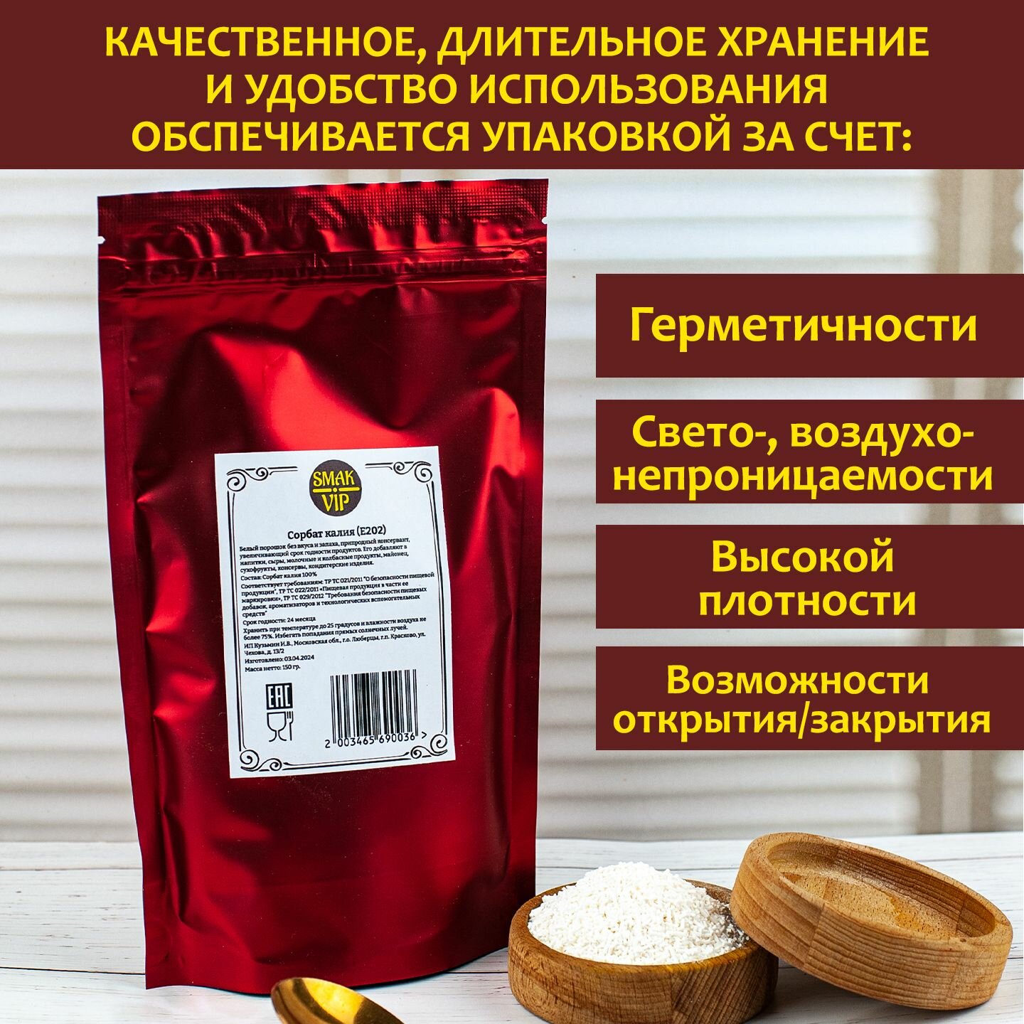 | Комплектация | Консервант сорбат калия (Е202) в дой паке с замком зип лок |