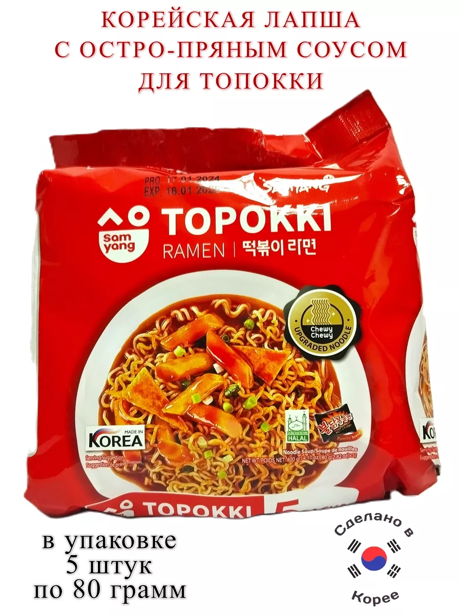 Лапша быстрого приготовления Самьянг острая Samyang Рамен со вкусом топокки, Халяль, 5 пачек по 80г