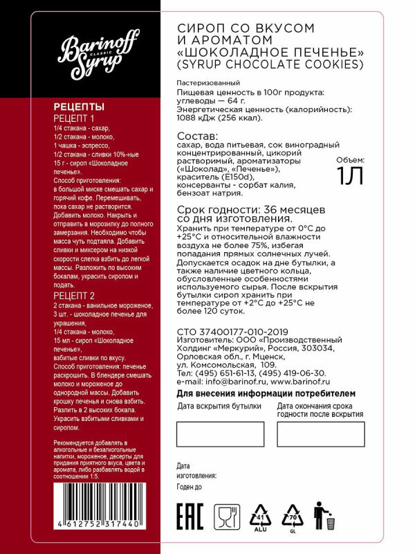 Сироп Barinoff Шоколадное печенье, для кофе и коктейлей, 1 л интересное: