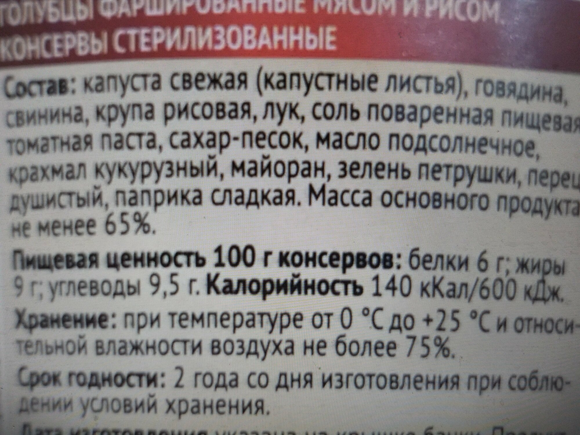 | Состав | Капуста свежая (капустные листья), говядина, свинина, крупа рисовая, лук, соль поваренная пищевая, томатная паста, сахар-песок, масло подсолнечное, крахмал кукурузный, майоран, зелень петрушки, перец душистый, паприка сладкая. |