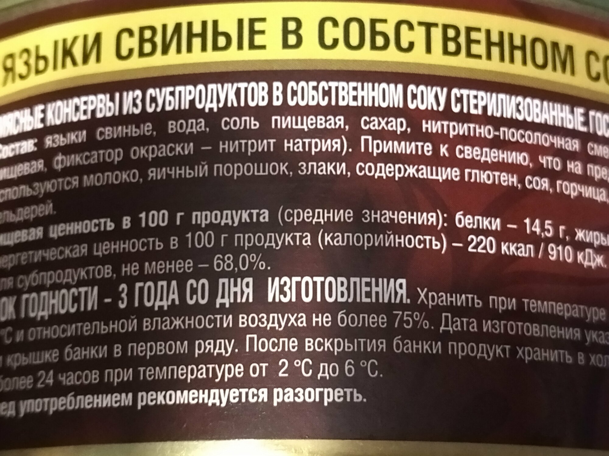 | Состав | Языки свиные, вода, соль пищевая, сахар, посолочная смесь (соль пищевая, фиксатор окраски нитрит натрия). |