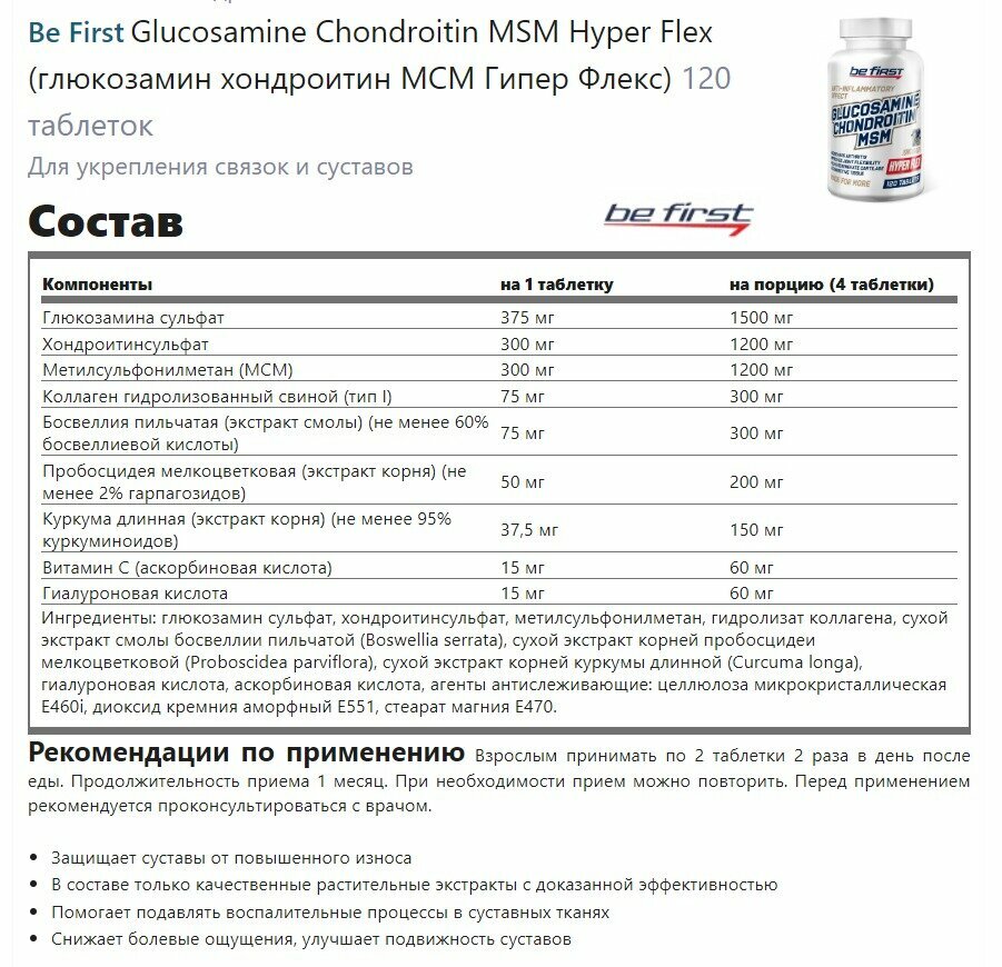Ниже Вы можете прочитать отзывы на Глюкозамин хондроитин мсм Be First glucosamine chondroitin msm Hyper Flex, для суставов и связок 120 таблеток, ознакомится с подробными характеристиками, посмотреть интересные обзоры и фотографии на Глюкозамин хондроитин мсм Be First glucosamine chondroitin msm Hyper Flex, для суставов и связок 120 таблеток.