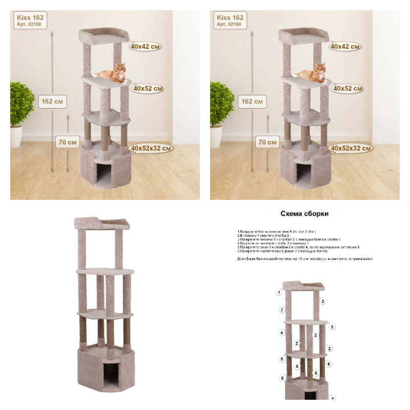 Когтеточка для кошек с домиком и лежанками "Етк Зоо" Kiss 162, 40*52*162, ковролин, джут