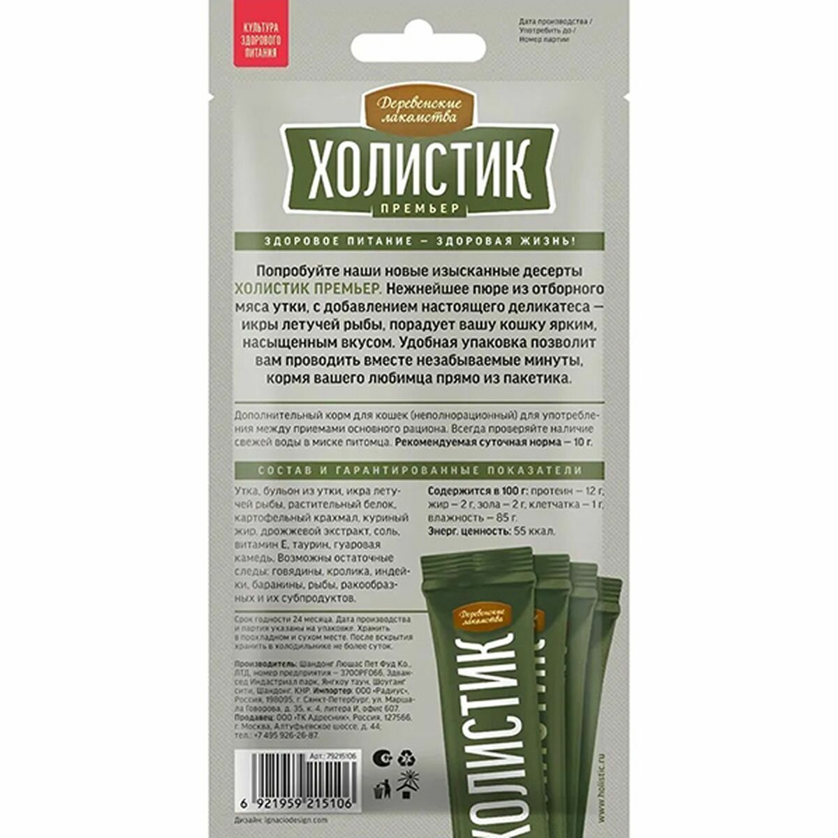 | Дополнительная информация | Попробуйте наши новые изысканные десерты холистик премьер. Нежнейшее пюре из отборного мяса утки с добавлением настоящего деликатеса - икры летучей рыбы, порадует вашу кошку ярким, незабываемым вкусом. Удобная упаковка позволит Вам провести вместе незабываемые минуты, кормя Вашего любимца прямо из пакетика. |