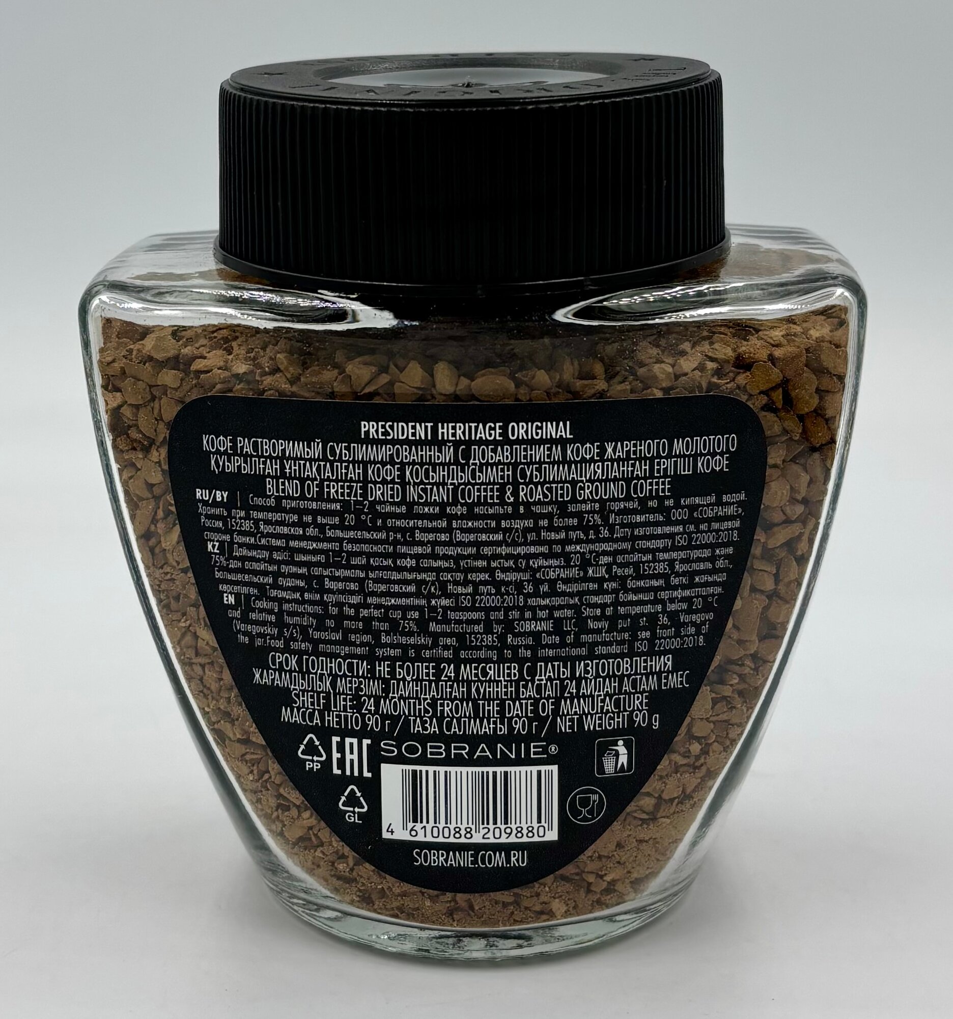 | Состав | Президент Оригинал - кофе растворимый сублимированный с добавлением жареного молотого. |