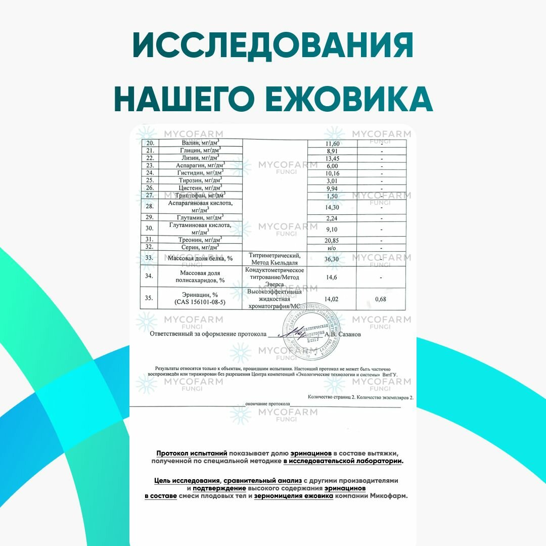 | Дополнительная информация | Эринацины и Гериценоны выступают топливом для формирования BDNF и NGF белков. BDNF и NGF белки служат для создания новых нейронных связей, повышают активность центральных нейронов гиппокампа. |