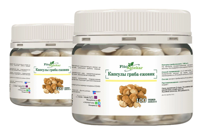 Ежовик гриб гребенчатый в капсулах Фито-Аптекарь, натуральный пищевой продукт 100 шт*2 упаковки