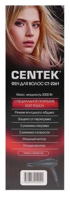 Ниже Вы можете прочитать отзывы на Фен для волос CENTEK CT-2261 - 1600Вт/ 3 температурных режима, ознакомится с подробными характеристиками, посмотреть интересные обзоры и фотографии на Фен для волос CENTEK CT-2261 - 1600Вт/ 3 температурных режима.