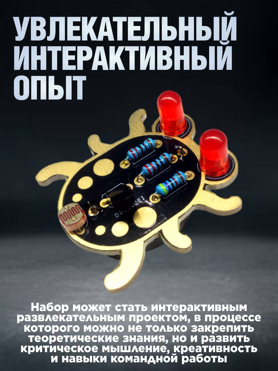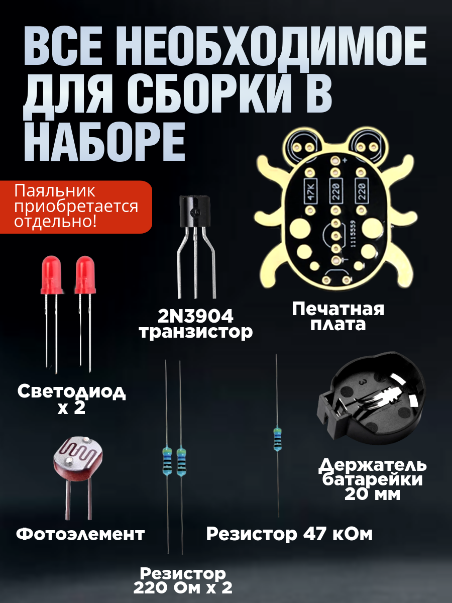 | Комплектация | Печатная плата, светодиоды - 2 шт., резистор, резисторы 220 - 2 шт., транзистор, фотоэлемент, зажим для батарейки |