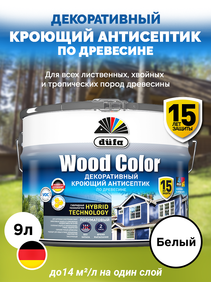Декоративный Кроющий Антисептик Dufa Wood Color 9л Белый по Древесине, Полуматовый для Внутренних и Наружных Работ / Дюфа Вуд Колор.