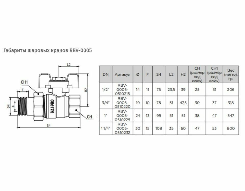 Кран шаровой полнопроходной ROMMER RBV-0005 - 1"1/4 (ВР/НР-американка, PN40, t130°C, ручка-бабочка)