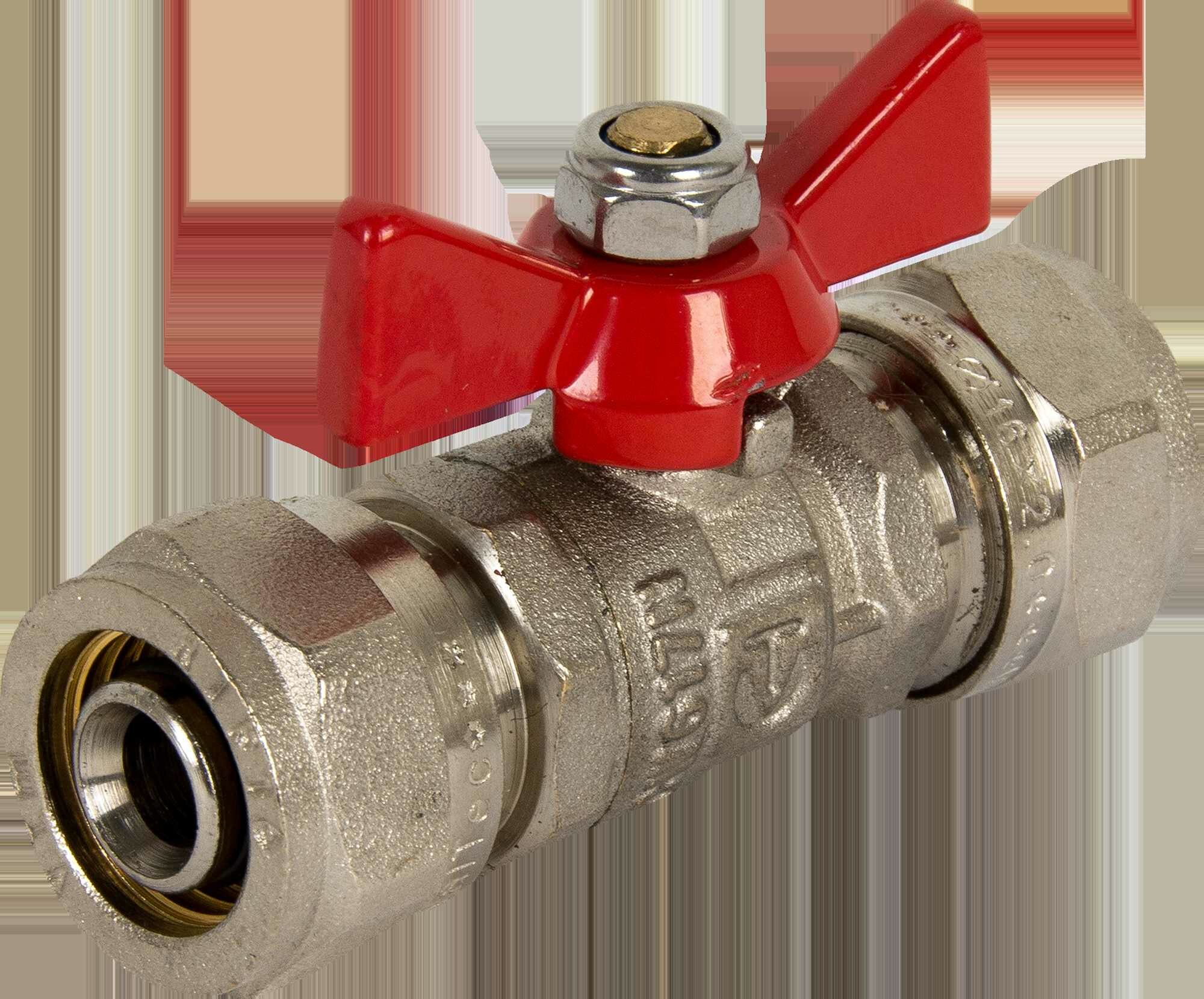 Кран шаровой латунный Valtec 16 обж(ц) х 16 обж(ц) для металлопластиковых труб бабочка прямой (VT.343.N.1616)