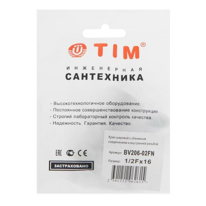 Кран шаровой для МП труб d16 мм х 1/2", цанга/гайка, бабочка TIM, арт. BV206-02FN