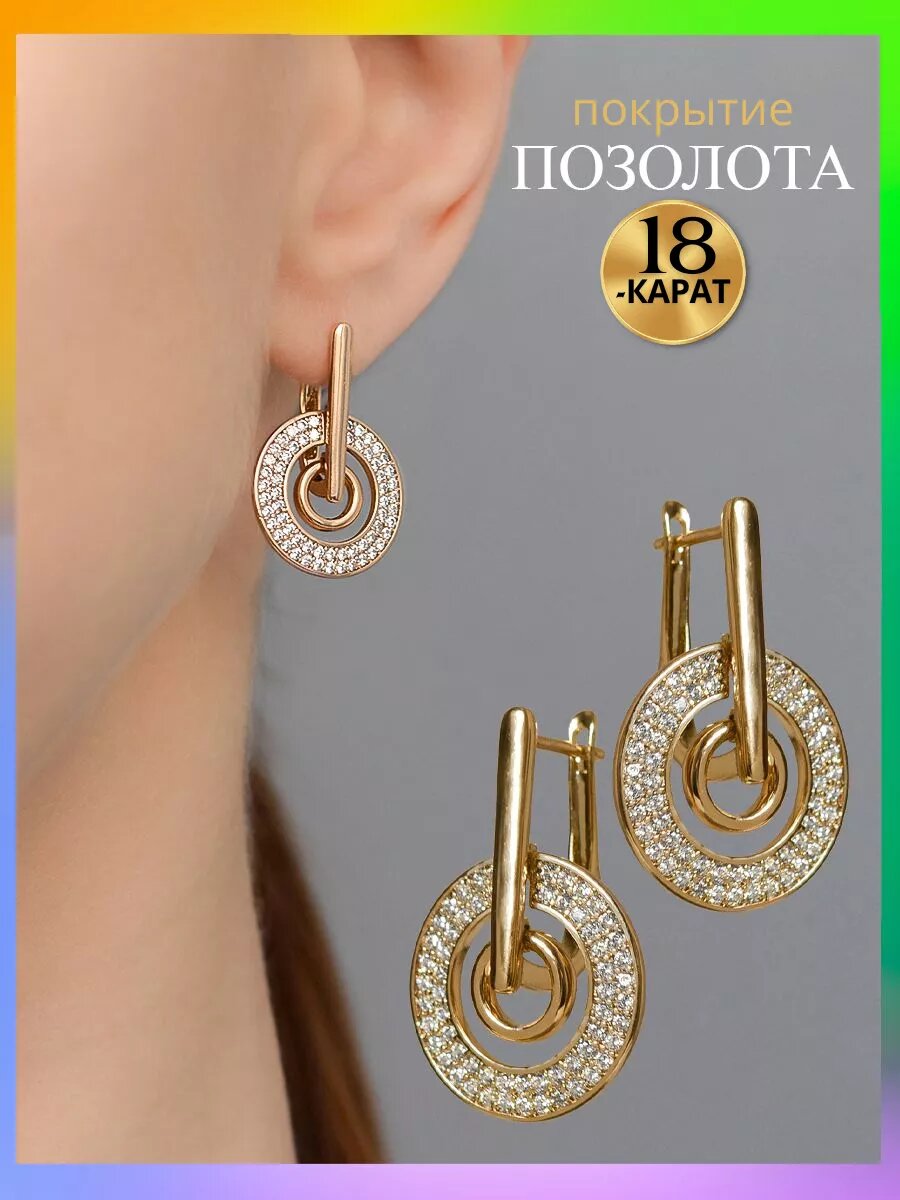 Купить Серьги бижутерия длинные с подвеской круг, как серьги золотые 585 с английским замком, позолоченные с камнями из медицинского сплава, ювелирный, родирование
