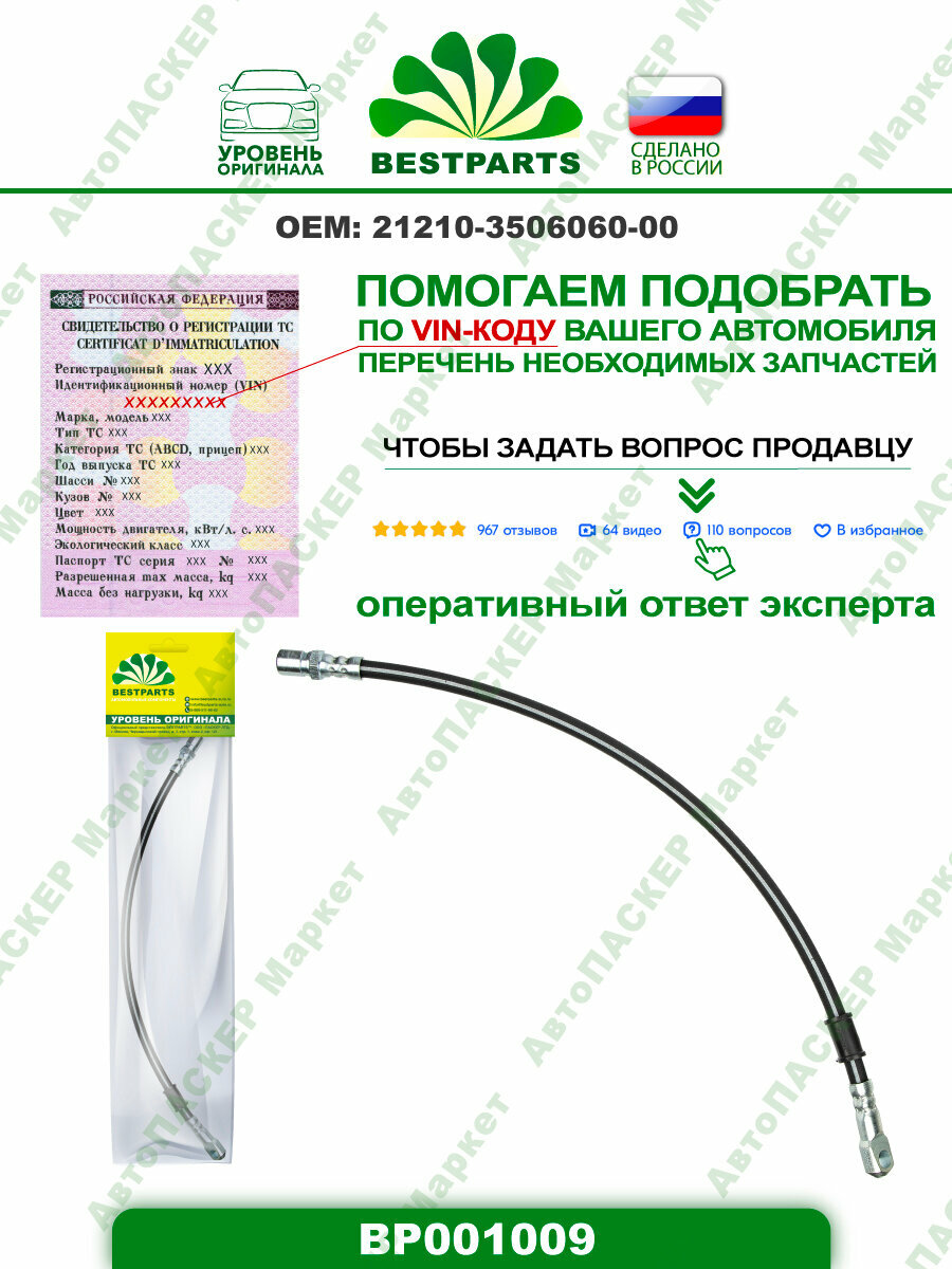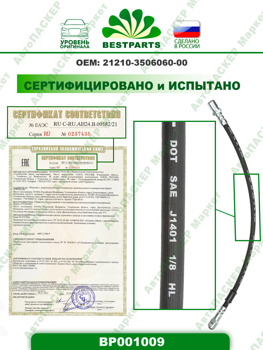 Шланг тормозной передний, длинный, 510 мм, для а/м ВАЗ Лада 2121/2131/21213/21213-214i/2120 Нива, гибкий, 1 шт, ОЕМ 21213506060, BP001009, 42839 интересное: