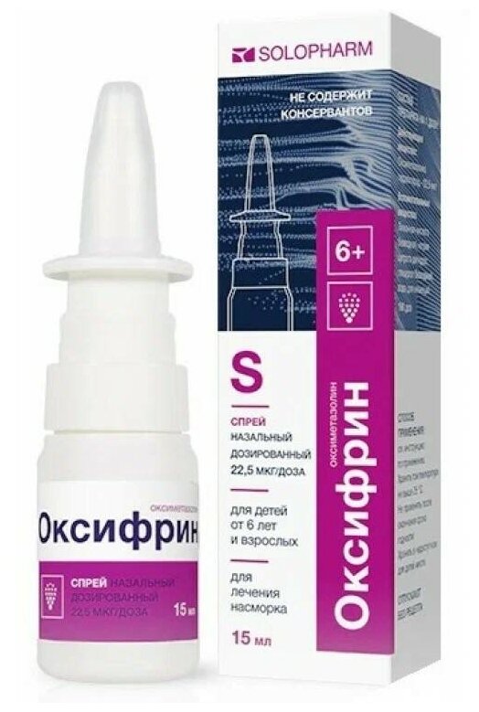 | Показания к применению | - Лечение острых респираторных заболеваний, сопровождающихся насморком;- аллергический ринит;- вазомоторный ринит;- для восстановления дренажа при воспалении придаточных пазух полости носа, евстахиите, среднем отите;- для устранения отека перед диагностическими манипуляциями в носовых ходах.Противопоказания:- Повышенная чувствительность к компонентам препарата;- атрофический (сухой) ринит;- закрытоугольная глаукома;- состояние после транссфеноидальной гипофизэктомии;- хирургические вмешательства на твердой мозговой оболочке (в анамнезе);- детский возраст до 1 года - для Оксифрин, спрей назальный дозированный 11,25 мкг/доза;- детский возраст до 6 лет - для Оксифрин, спрей назальный дозированный 22,5 мкг/доза. |