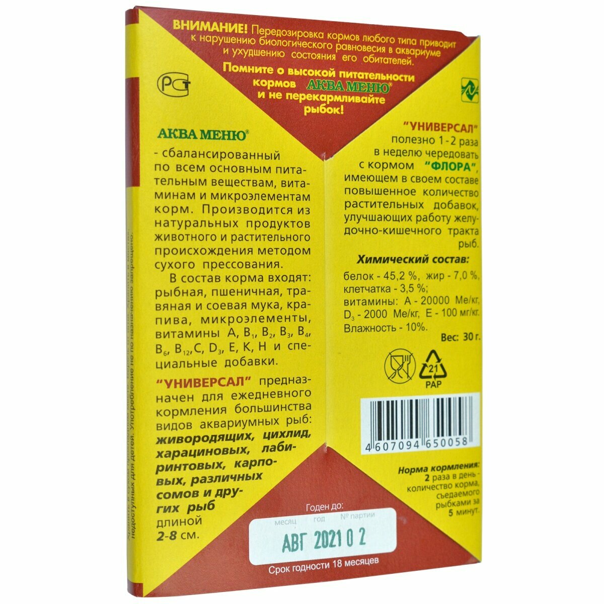 Ниже Вы можете прочитать отзывы на Аква Меню "Универсал" корм для рыб 30г, ознакомится с подробными характеристиками, посмотреть интересные обзоры и фотографии на Аква Меню "Универсал" корм для рыб 30г.