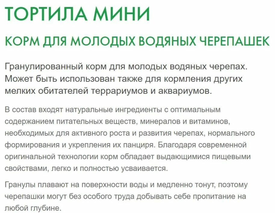 | Плюсы: | Мои маленькие черепахи едят хорошо и красноухие и мускусные. Красноухая черепаха живет на этом корме уже 14 лет, для нее беру тоже корм этого производителя. |
