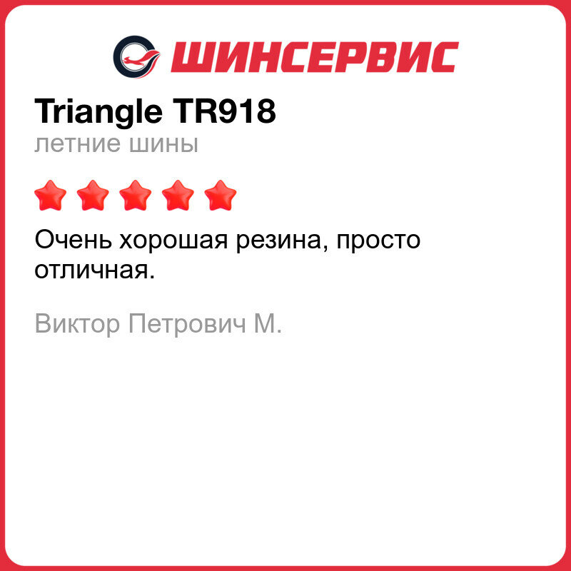 | Отзыв: | Второй раз покупаю Триангл. Качество супер , ходят долго , как Мишлен . Воду отлично отводят. Перед покупкой штудировал отзывы на Дром . Купил на свой страх и плюсы почувствовал сразу . 3-4 сезона не предел. |