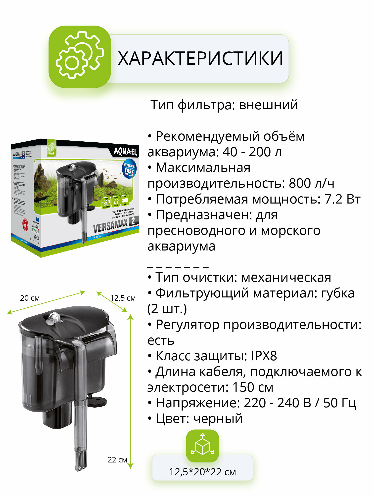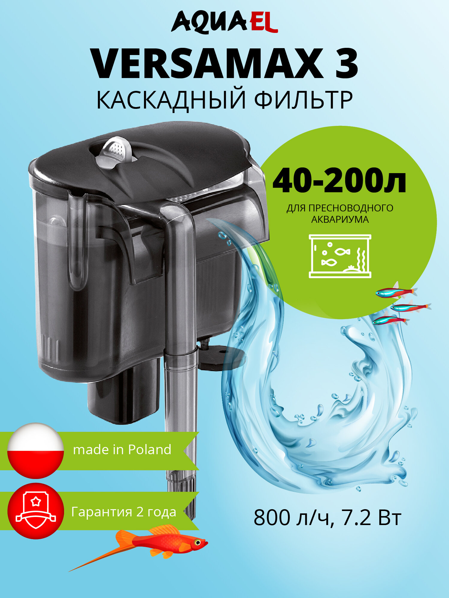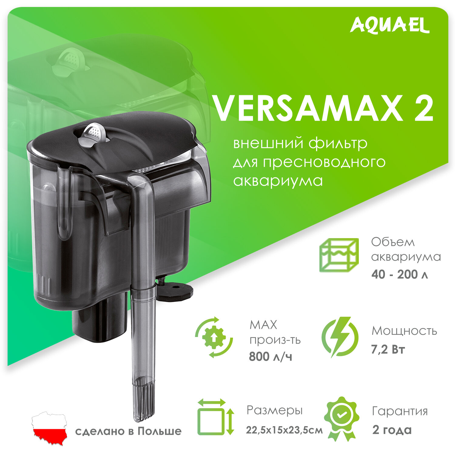 Фильтр внешний AQUAEL VERSAMAX 2 для аквариума 40 - 200 л (800 л/ч, 7.2 Вт), навесной
