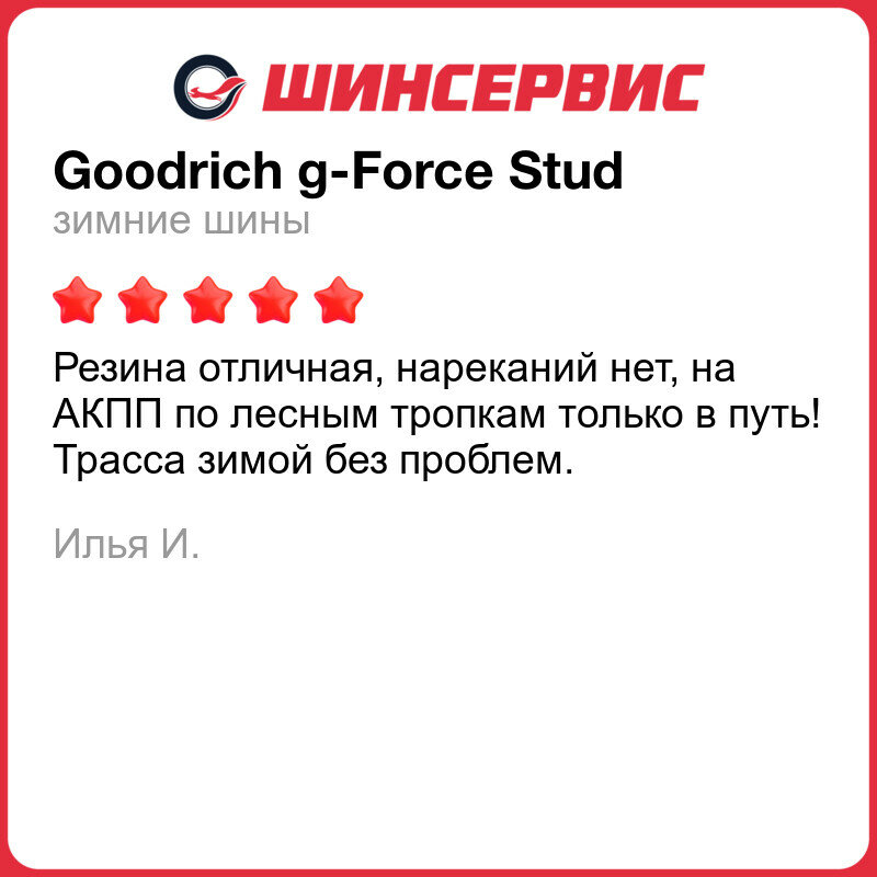 | Отзыв: | Спасибо компании Гудрич! резина очень классная. Очень мягкая не шумная цепкость хорошая и Большое спасибо доставки все шипы на месте все четыре покрышки одинаковые |