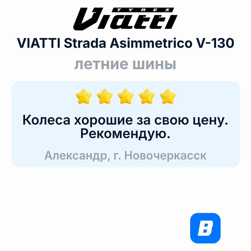 | Отзыв: | На Виатти езжу второе лето. Шины хорошие за свою цену. Отбалансировались быстро и без проблем. Управляемость комфортная и прогнозируемая. В дождь сцепление с покрытием отличное. Рекомендую. Стоит рассматривать данный вариант, я считаю. |