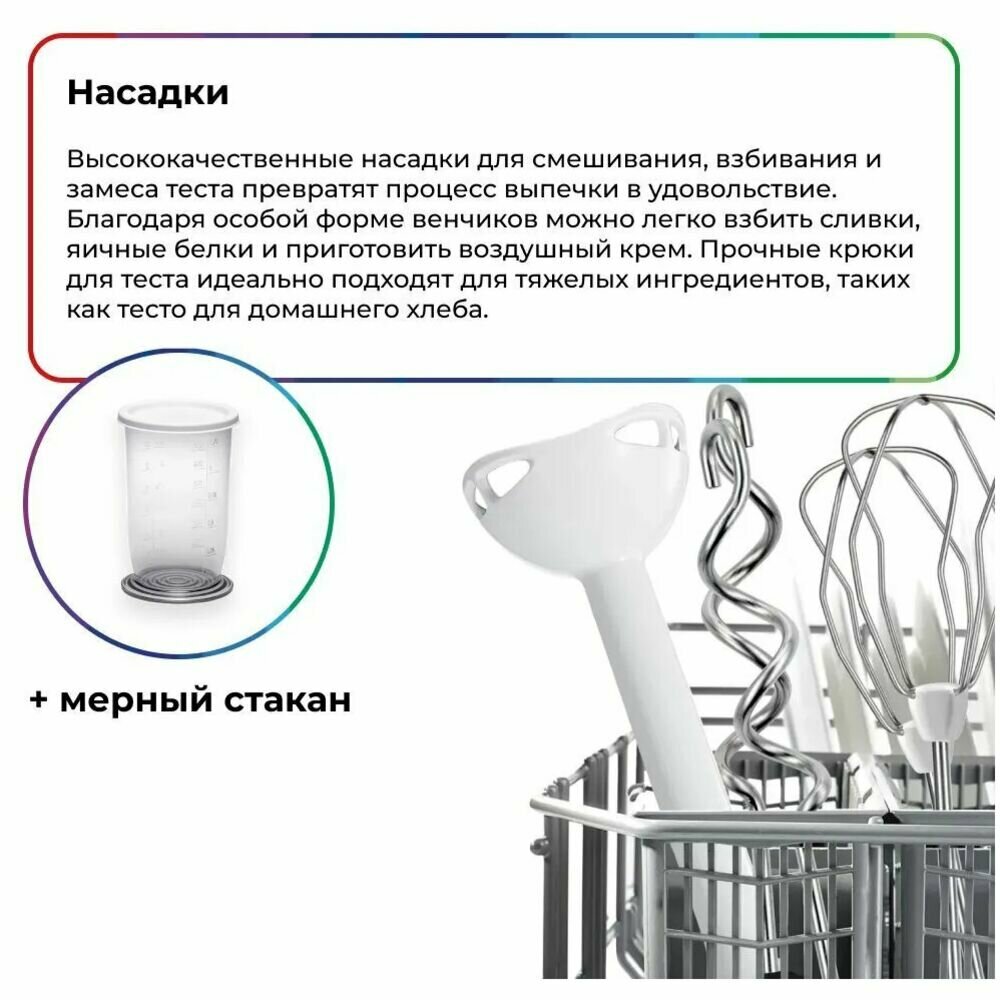 | Плюсы: | Комплектация. на данный момент в продаже нашла только эту модель где именно два венчика, погружной блендер и измельчитель. |
