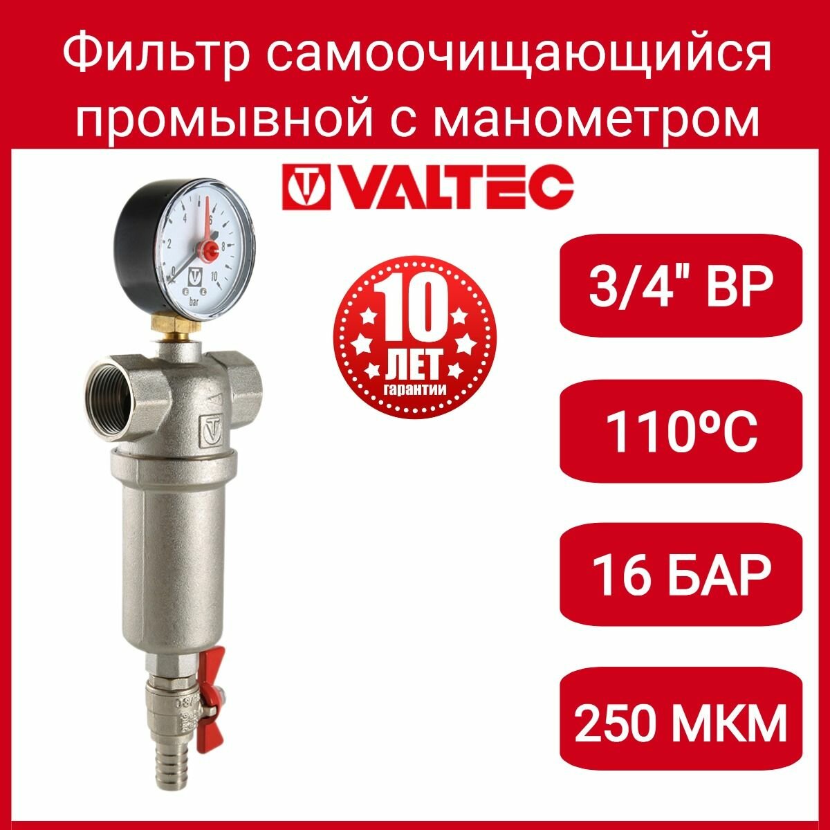 Фильтр тонкой очистки промывной VALTEC VT.389 - 3/4" (ВР/ВР, 250/1000 мкм, PN16, 110°C, манометр)