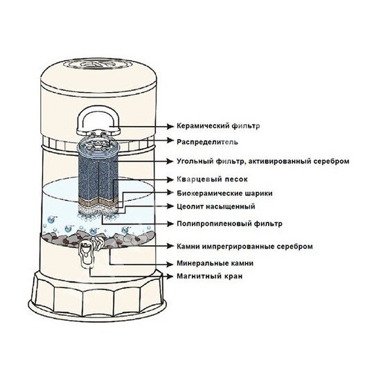 Очень красиво и необыкновенно смотрятся камни на дне (они минерализируют воду и насыщают серебром), удобный краник (ребенку 2 года сам наливает) и комплекта фильтров хватает на 2 года. |