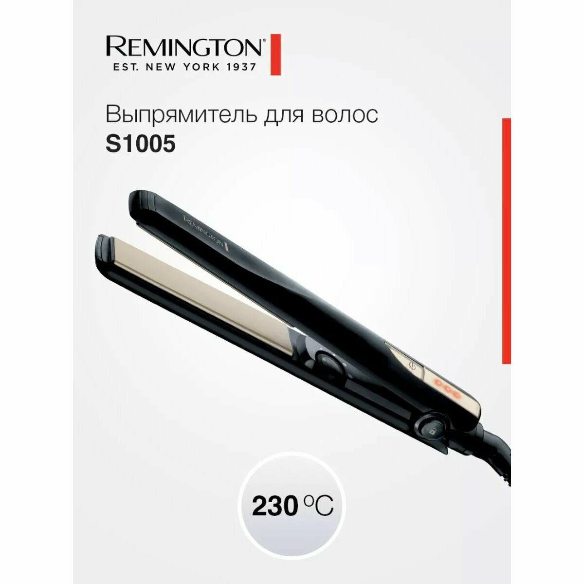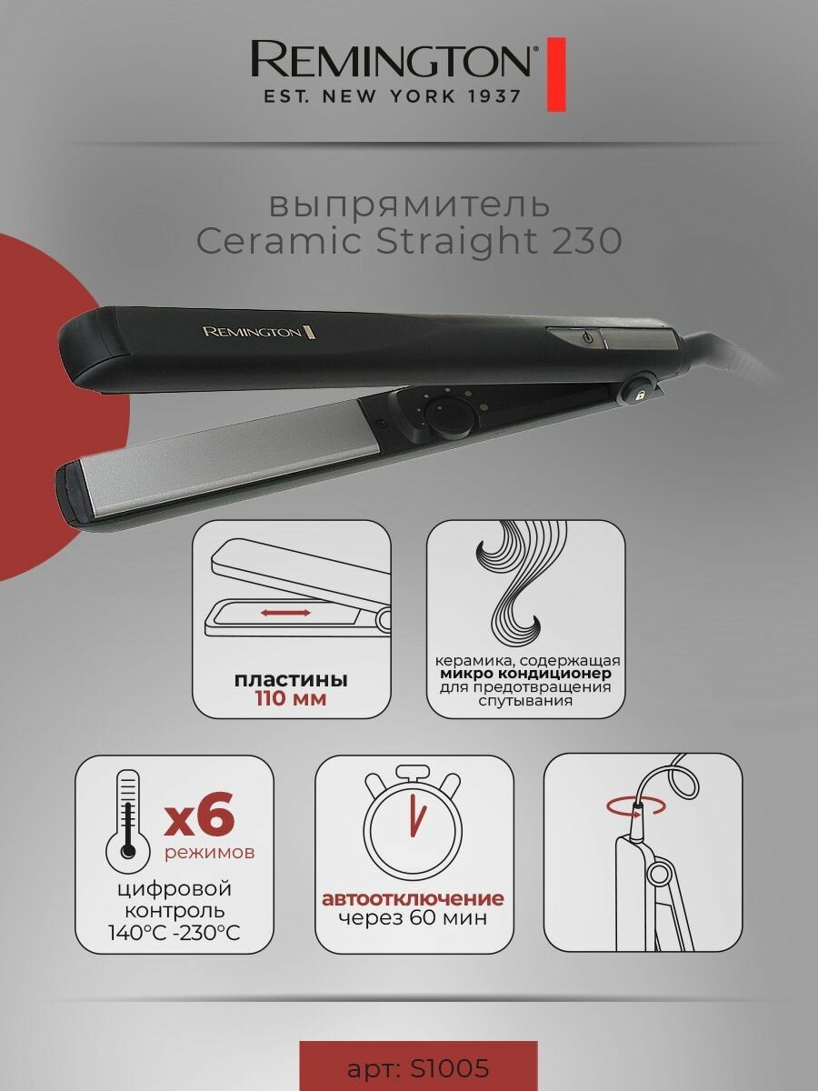 Выпрямитель для волос Remington Ceramic Straight 230 S1005, 48 Вт, вращение шнура на 360 градусов, максимальная температура 230 градусов